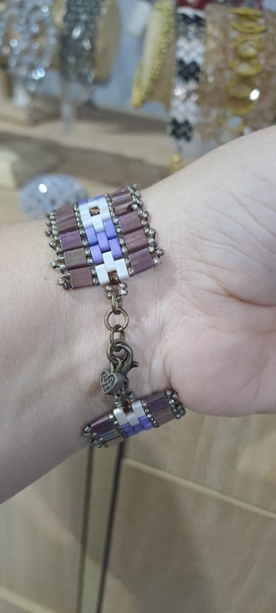 Para este brazalete vas a necesitar 8 grs de tilas, 4 grs de medias tilas, 2 grs de cada color, mostacillones o cristales n2, tanza de nylon 0.25, 1 aguja N12. Este brazalete no tiene tutorial en pdf, solo el video