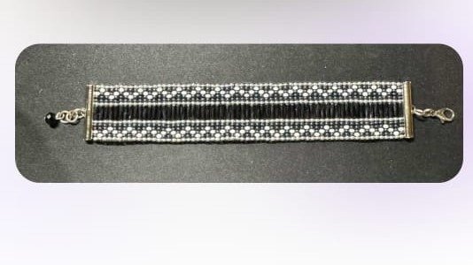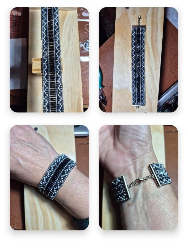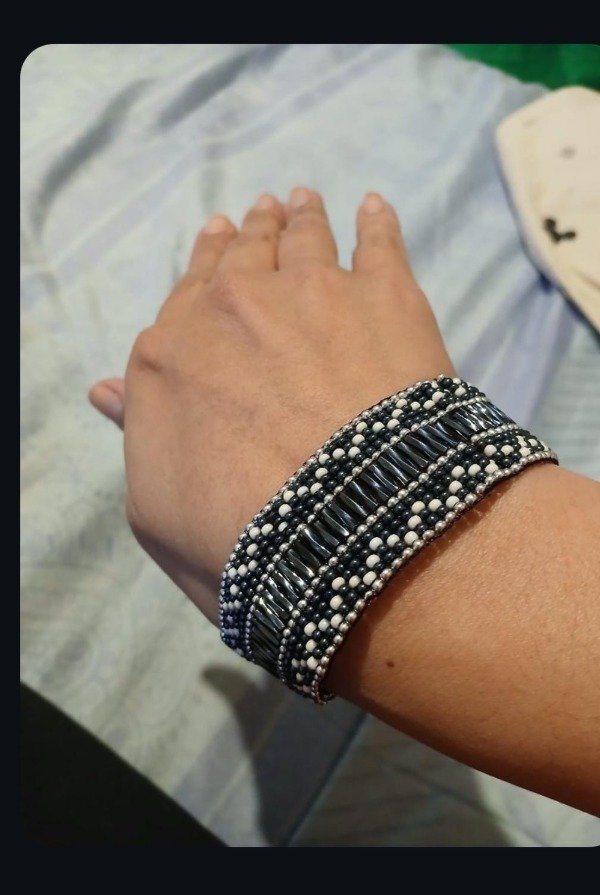Para este trabajo vas a necesitar mostacillas calibradas 2 tiras del color predominante (en el moldelo seria el peltre) 1 blanca, 1 plateada, 1 tira de canutillos, hilo sedil para el urdimbre y para tejer de 0.60, y aguja n 12. Terminales de pulsera tubular de 2,5 cm, mosqueton y argollas n 6