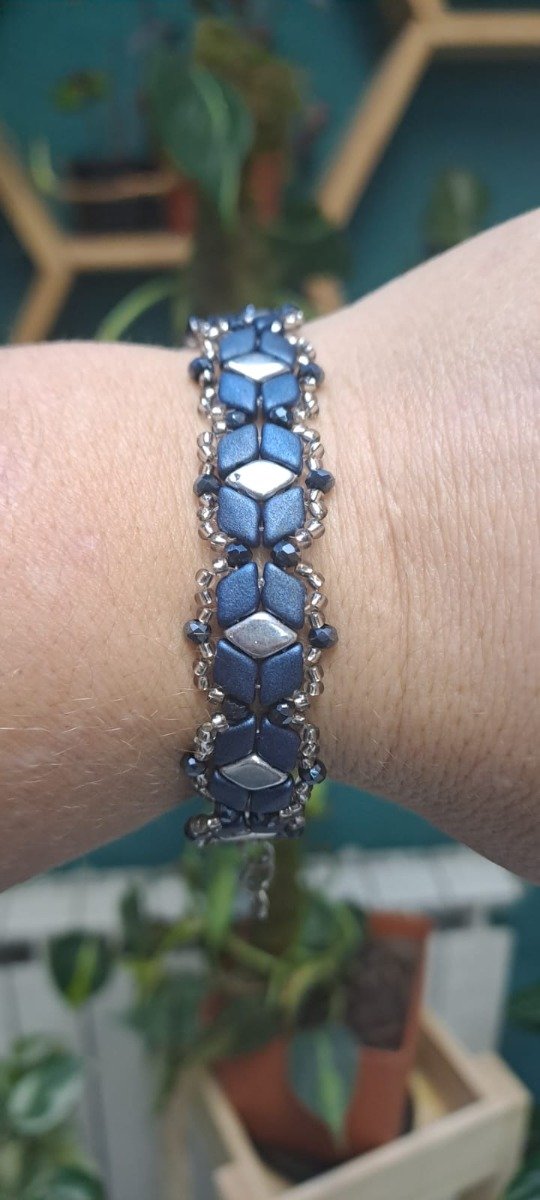 Para esta pulsera vas a necesitar tanza 0.25, aguja N12, 5 grs de diamond de un color, 1 gr de diamond de otro color, mostacillones o cristales n2, mostacillas. Este trabajo no tiene tutorial en pdf solo video